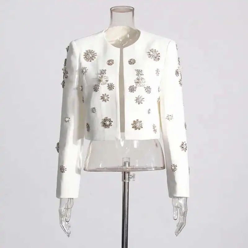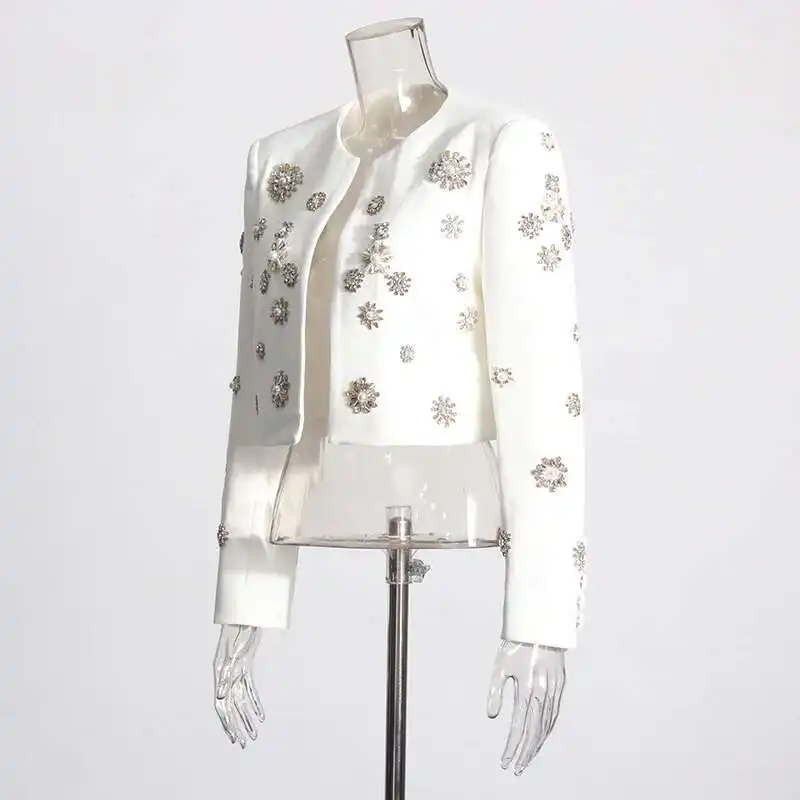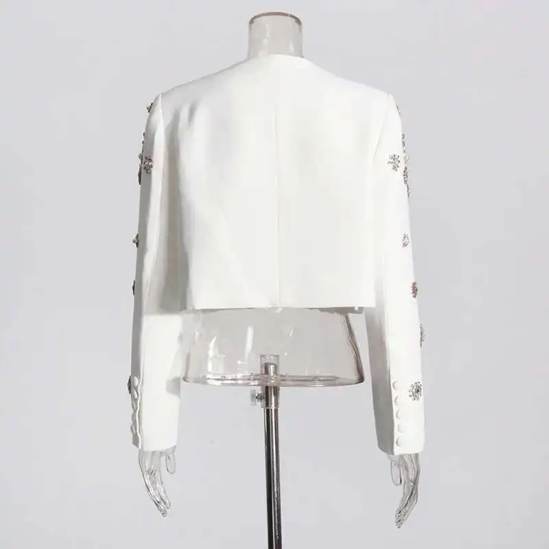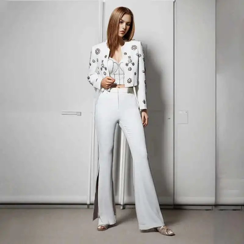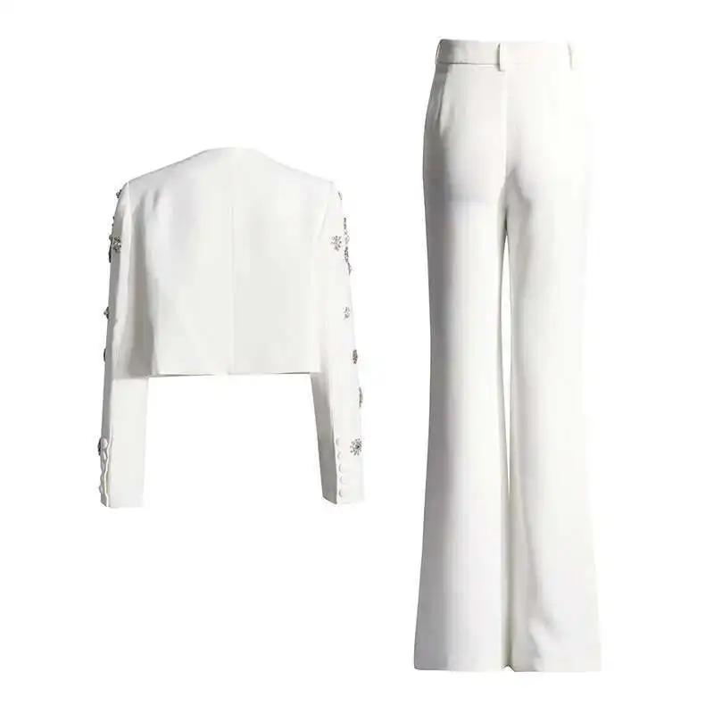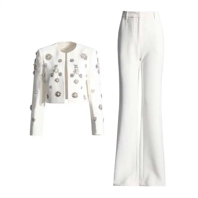 Brand Designer High Quality Beaded Diamonds Two Piece Women White Sets Jackets Suit Coats Long Pants Office Suits