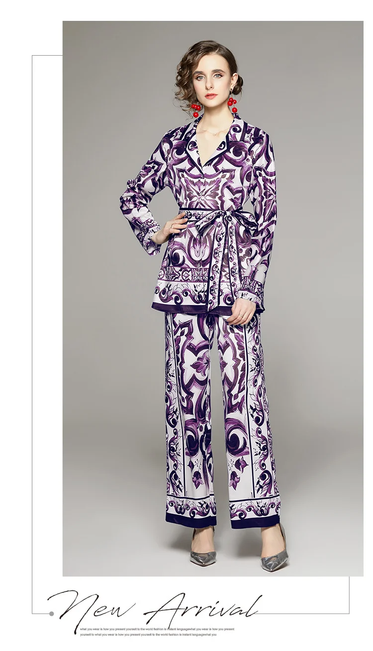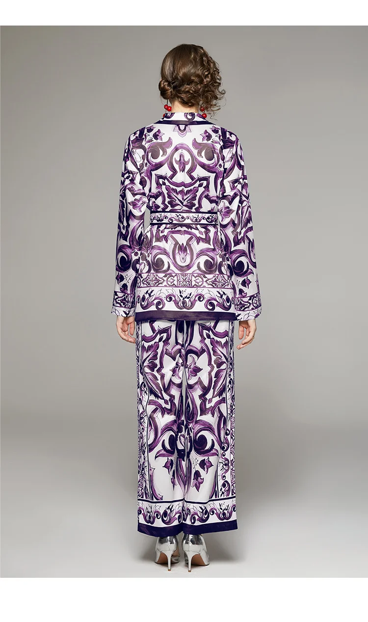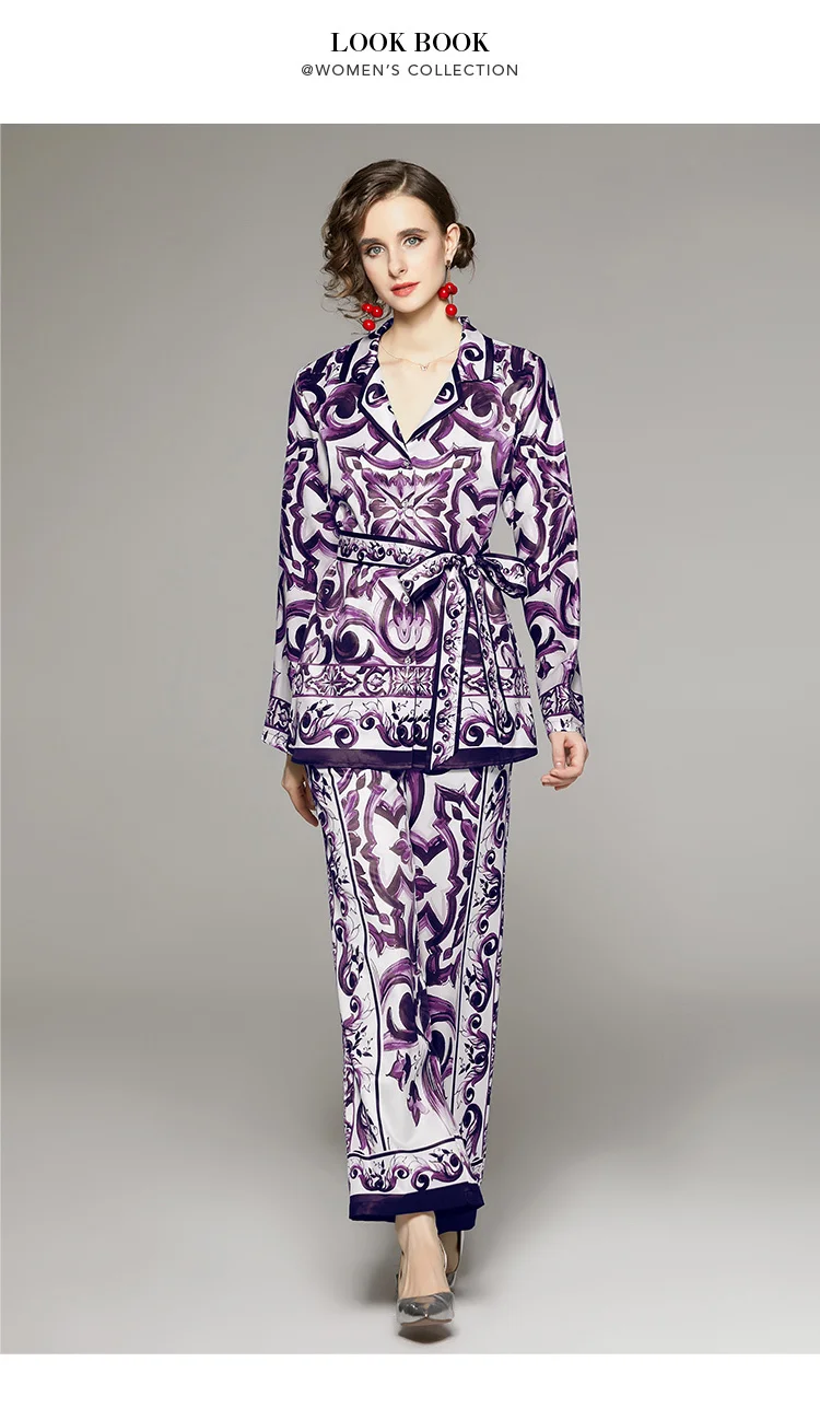 Casual Two Piece Set Women Floral Shirts Wide Leg Pants Suits 2pcs Outfit Purple Porcelain Print Summer Autumn Tops Trousers